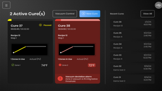 安全测试原理贯穿整个运行过程,形成多重防护体系。电气安全方面,接地故障断路器实时监测火线与零线的电流差值,当差值超过6mA时立即切断电源,防范触电风险;UL认证的电气元件则保障长期运行的绝缘性能。工艺安全方面,主机内置温度与真空超限阈值,当温度超过设定值5℃或真空压力低于25inHg时,立即触发声光报警,同时切断加热器电源并保持真空状态,防止材料报废或安全事故。操作安全方面,多级密码保护将用户权限分为操作员、技术员、管理员三级,避免非授权人员修改关键工艺参数(如固化温度、真空压力),保障工艺一致性。