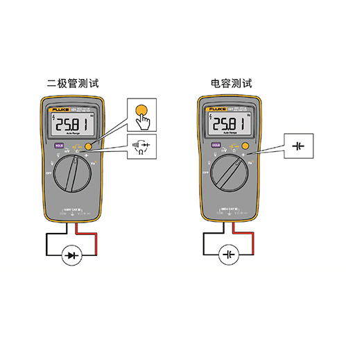采用“RC充放电计时法”,FLUKE101+内部提供固定频率方波信号,通过开关电路控制被测电容充放电,测量充放电时间常数τ=RC(R为内置标准电阻),进而推导电容值C=τ/R。不同量程通过切换标准电阻实现:低电容量程选用小阻值电阻,避免充放电时间过短;高电容量程选用大阻值电阻,提升测量效率,测量后需等待最长18秒确保读数稳定。由于测试导线存在寄生电容,50nF量程可能引入最大1.5nF误差,实际使用中可通过屏蔽导线优化。